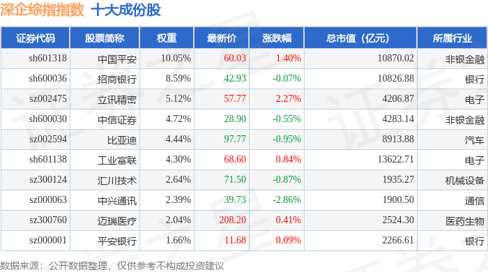 证券之星消息,11月12日,深企综指(399352)指数报收于10797.67点,跌0.33%,成交2035.9亿元,换手率2.2%。当日该指数成份股中,上涨的有119家,朗坤科技以15.36%的涨幅领涨,下跌的有279家,方直科技以14.25%的跌幅领跌。