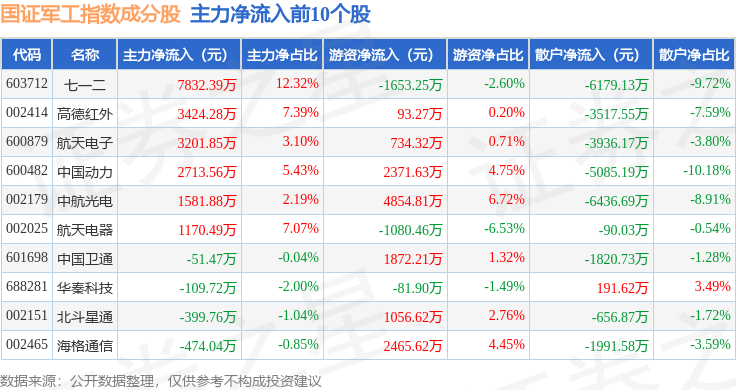 资金流向方面,国证军工(399368)指数成份股当日主力资金净流出合计24.35亿元,游资资金净流入合计5.91亿元,散户资金净流入合计18.44亿元。成份股资金流向详情见下表: