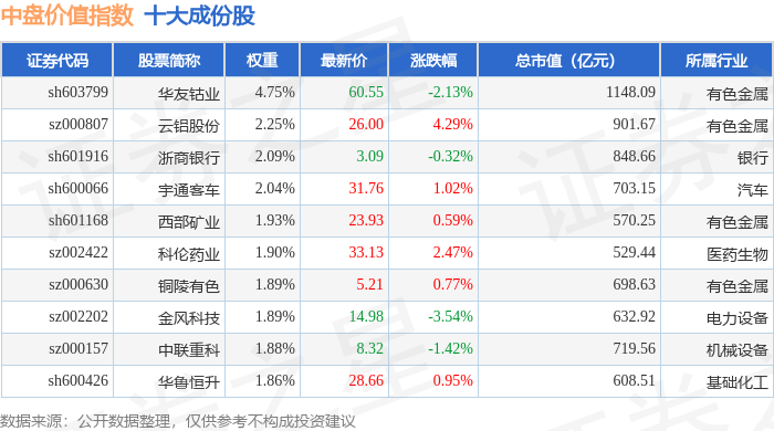 证券之星消息,11月12日,中盘价值(399375)指数报收于5882.66点,跌0.01%,成交538.52亿元,换手率1.15%。当日该指数成份股中,上涨的有50家,云铝股份以4.29%的涨幅领涨,下跌的有46家,正泰电器以4.42%的跌幅领跌。
