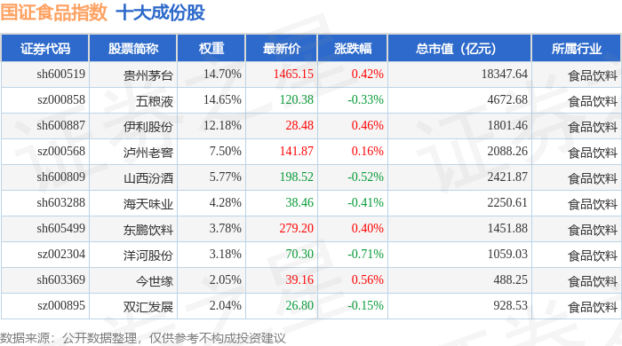 证券之星消息,11月12日,国证食品(399396)指数报收于18962.19点,涨0.24%,成交276.3亿元,换手率1.18%。当日该指数成份股中,上涨的有22家,中粮糖业以9.99%的涨幅领涨,下跌的有28家,乖宝宠物以2.34%的跌幅领跌。