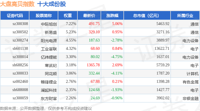 证券之星消息,11月12日,大盘高贝(399405)指数报收于3149.12点,跌0.44%,成交1903.01亿元,换手率1.42%。当日该指数成份股中,上涨的有18家,中际旭创以5.06%的涨幅领涨,下跌的有32家,隆基绿能以7.35%的跌幅领跌。
