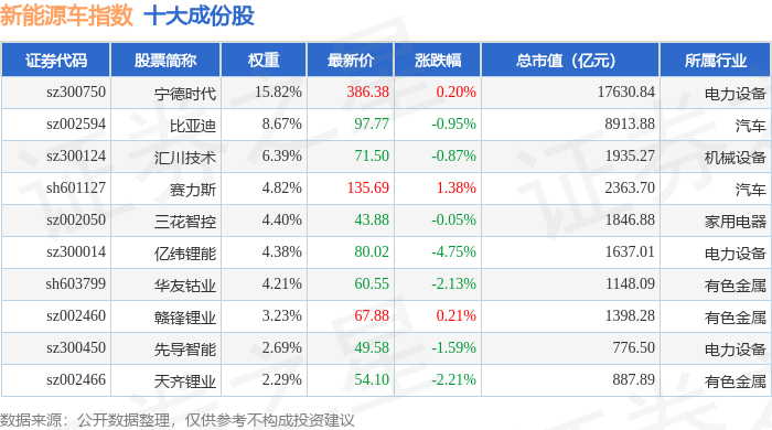 证券之星消息,11月12日,新能源车(399417)指数报收于3890.46点,跌1.06%,成交1033.26亿元,换手率3.37%。当日该指数成份股中,上涨的有11家,恩捷股份以3.87%的涨幅领涨,下跌的有38家,亿纬锂能以4.75%的跌幅领跌。