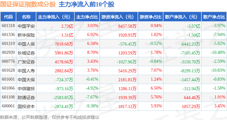 资金流向方面,国证保证(399420)指数成份股当日主力资金净流出合计15.66亿元,游资资金净流入合计13.16亿元,散户资金净流入合计2.5亿元。成份股资金流向详情见下表: