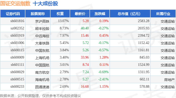 国证交运(399433)指数十大成份股详情如下: