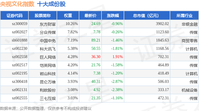 资金流向方面,央视文化(399557)指数成份股当日主力资金净流出合计30.35亿元,游资资金净流入合计9.42亿元,散户资金净流入合计20.93亿元。成份股资金流向详情见下表: