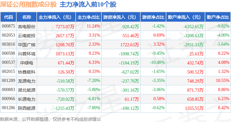 资金流向方面,深证公用(399622)指数成份股当日主力资金净流出合计2.89亿元,游资资金净流入合计6589.7万元,散户资金净流入合计2.23亿元。成份股资金流向详情见下表: