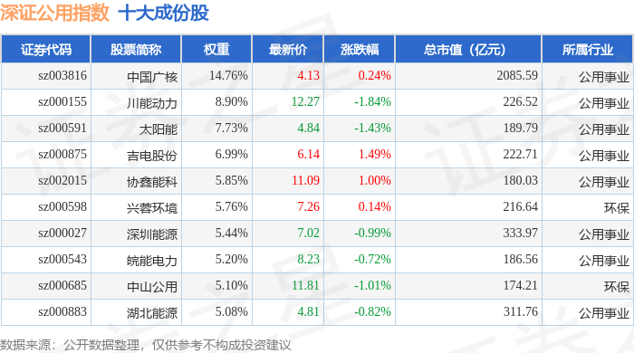 证券之星消息,11月12日,深证公用(399622)指数报收于1815.88点,跌0.46%,成交53.92亿元,换手率0.79%。当日该指数成份股中,上涨的有5家,云南能投以2.81%的涨幅领涨,下跌的有15家,佛燃能源以2.19%的跌幅领跌。