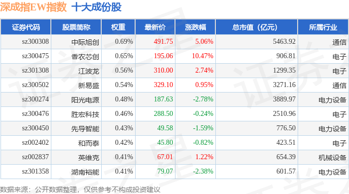证券之星消息,11月12日,深成指EW(399659)指数报收于4640.45点,跌0.67%,成交4960.73亿元,换手率1.83%。当日该指数成份股中,上涨的有147家,香农芯创以10.47%的涨幅领涨,下跌的有344家,兴森科技以8.02%的跌幅领跌。