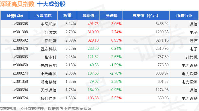 证券之星消息,11月12日,深证高贝(399662)指数报收于2373.24点,跌1.13%,成交2165.54亿元,换手率2.62%。当日该指数成份股中,上涨的有23家,捷佳伟创以5.53%的涨幅领涨,下跌的有77家,兴森科技以8.02%的跌幅领跌。
