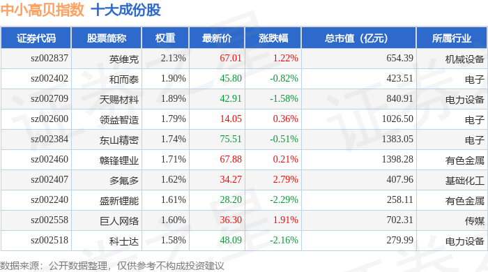 证券之星消息,11月12日,中小高贝(399664)指数报收于1450.67点,跌1.08%,成交1045.85亿元,换手率3.22%。当日该指数成份股中,上涨的有24家,普利特以5.8%的涨幅领涨,下跌的有75家,兴森科技以8.02%的跌幅领跌。