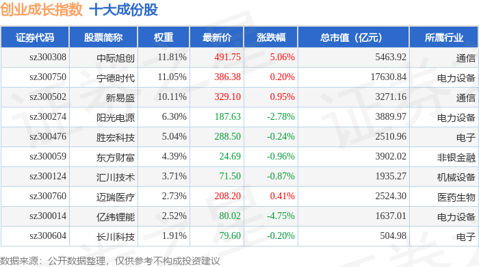 创业成长(399667)指数十大成份股详情如下: