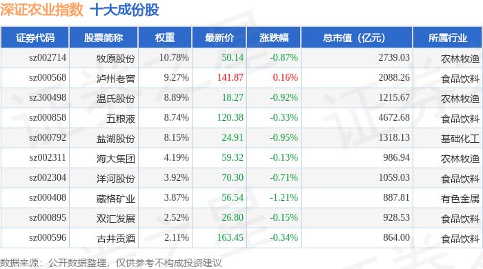 证券之星消息,11月12日,深证农业(399669)指数报收于8796.33点,跌0.65%,成交251.98亿元,换手率1.59%。当日该指数成份股中,上涨的有13家,农产品以10.05%的涨幅领涨,下跌的有37家,鲁西化工以3.76%的跌幅领跌。