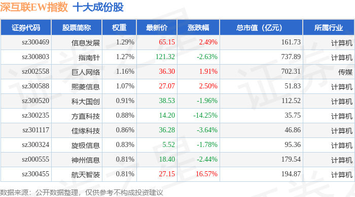 证券之星消息,11月12日,深互联EW(399677)指数报收于5605.73点,跌0.7%,成交563.36亿元,换手率2.63%。当日该指数成份股中,上涨的有35家,航天智装以16.57%的涨幅领涨,下跌的有127家,方直科技以14.25%的跌幅领跌。