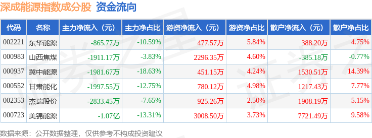 资金流向方面,深成能源(399680)指数成份股当日主力资金净流出合计2.03亿元,游资资金净流入合计7938.96万元,散户资金净流入合计1.24亿元。成份股资金流向详情见下表: