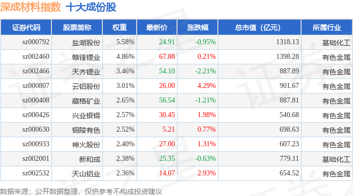证券之星消息,11月12日,深成材料(399681)指数报收于1208.23点,涨0.02%,成交675.57亿元,换手率1.81%。当日该指数成份股中,上涨的有32家,云铝股份以4.29%的涨幅领涨,下跌的有45家,大中矿业以3.77%的跌幅领跌。