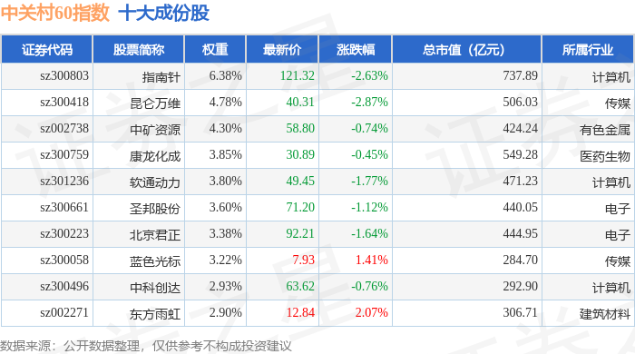 中关村60(399697)指数十大成份股详情如下: