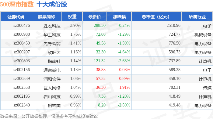 500深市(399802)指数十大成份股详情如下: