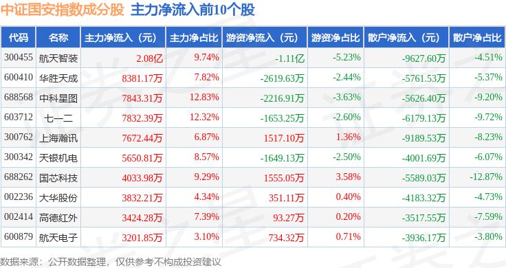 资金流向方面,中证国安(399813)指数成份股当日主力资金净流出合计61.45亿元,游资资金净流入合计13.31亿元,散户资金净流入合计48.14亿元。成份股资金流向详情见下表: