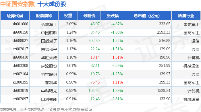 证券之星消息,11月12日,中证国安(399813)指数报收于7260.78点,跌1.03%,成交785.42亿元,换手率2.08%。当日该指数成份股中,上涨的有32家,航天智装以16.57%的涨幅领涨,下跌的有121家,格尔软件以7.71%的跌幅领跌。