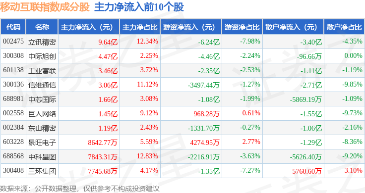资金流向方面,移动互联(399970)指数成份股当日主力资金净流出合计60.28亿元,游资资金净流入合计8.29亿元,散户资金净流入合计51.99亿元。成份股资金流向详情见下表: