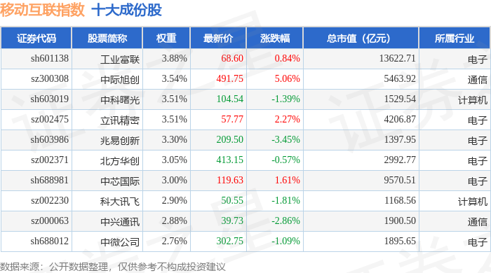 移动互联(399970)指数十大成份股详情如下: