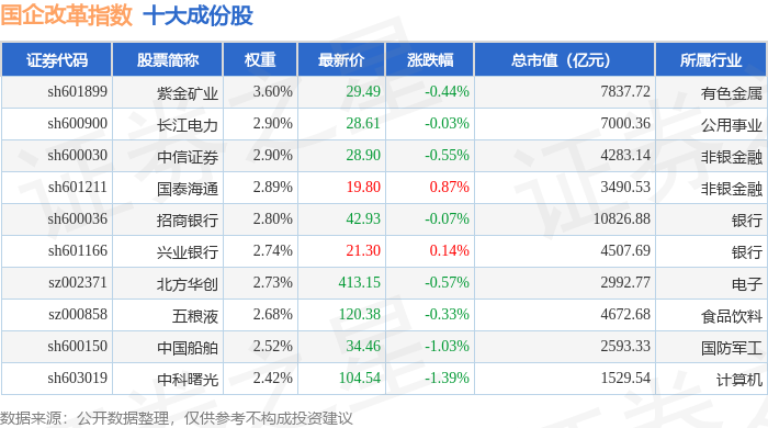 证券之星消息,11月12日,国企改革(399974)指数报收于1904.66点,跌0.57%,成交1264.46亿元,换手率0.67%。当日该指数成份股中,上涨的有25家,中国铝业以6.65%的涨幅领涨,下跌的有73家,许继电气以4.78%的跌幅领跌。