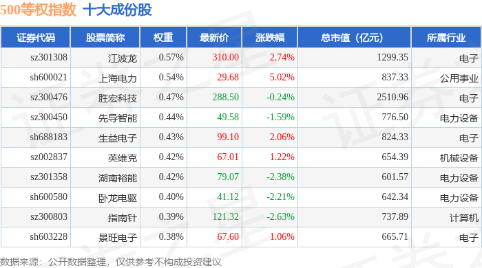 证券之星消息,11月12日,500等权(399982)指数报收于8895.44点,跌0.65%,成交3138.4亿元,换手率1.64%。当日该指数成份股中,上涨的有159家,石化油服以10.21%的涨幅领涨,下跌的有326家,湘财股份以8.12%的跌幅领跌。