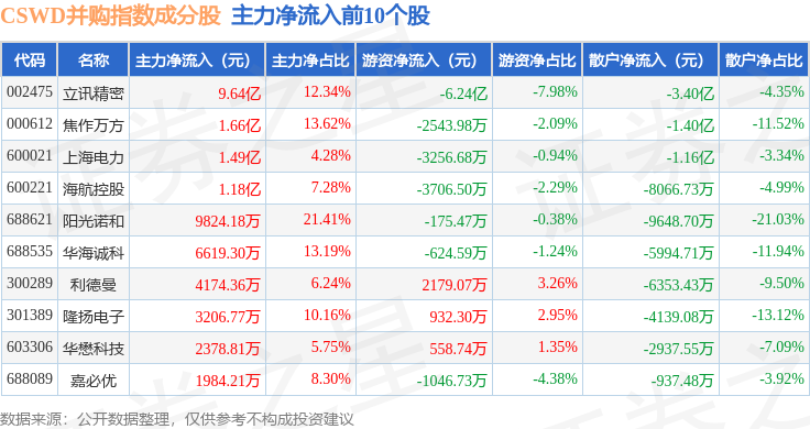 资金流向方面,CSWD并购(399992)指数成份股当日主力资金净流出合计9.47亿元,游资资金净流出合计2.5亿元,散户资金净流入合计11.96亿元。成份股资金流向详情见下表:
