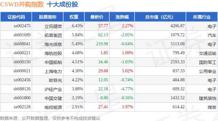 CSWD并购(399992)指数十大成份股详情如下: