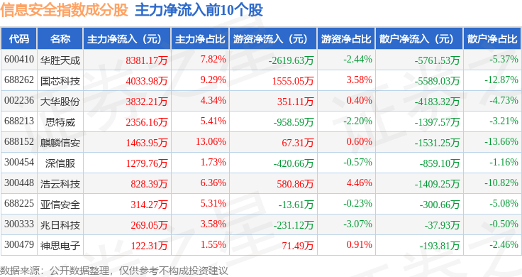 资金流向方面,信息安全(399994)指数成份股当日主力资金净流出合计24.87亿元,游资资金净流入合计6.54亿元,散户资金净流入合计18.33亿元。成份股资金流向详情见下表: