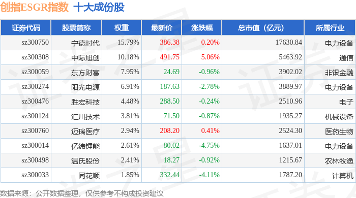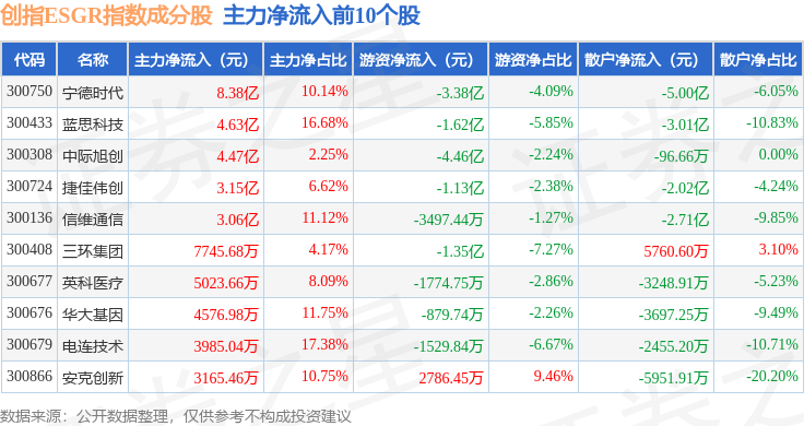 资金流向方面,创指ESGR(470028)指数成份股当日主力资金净流出合计51.2亿元,游资资金净流入合计6.84亿元,散户资金净流入合计44.35亿元。成份股资金流向详情见下表: