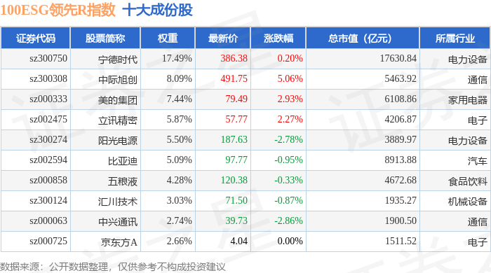 证券之星消息,11月12日,100ESG领先R(470030)指数报收于9238.84点,涨0.15%,成交1262.14亿元,换手率1.16%。当日该指数成份股中,上涨的有17家,中际旭创以5.06%的涨幅领涨,下跌的有32家,晶盛机电以7.23%的跌幅领跌。