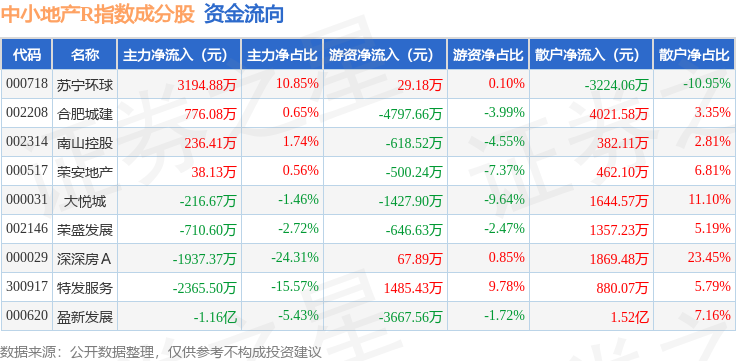 资金流向方面,中小地产R(471002)指数成份股当日主力资金净流出合计1.25亿元,游资资金净流出合计1.01亿元,散户资金净流入合计2.26亿元。成份股资金流向详情见下表: