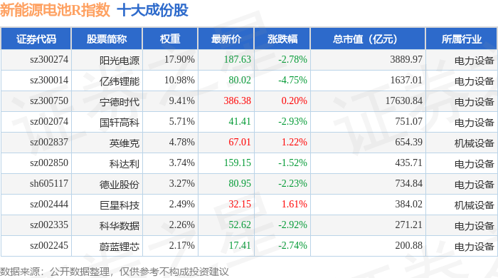 证券之星消息,11月12日,新能源电池R(480027)指数报收于3724.98点,跌2.35%,成交609.35亿元,换手率2.58%。当日该指数成份股中,上涨的有8家,巨星科技以1.61%的涨幅领涨,下跌的有42家,锦浪科技以6.77%的跌幅领跌。