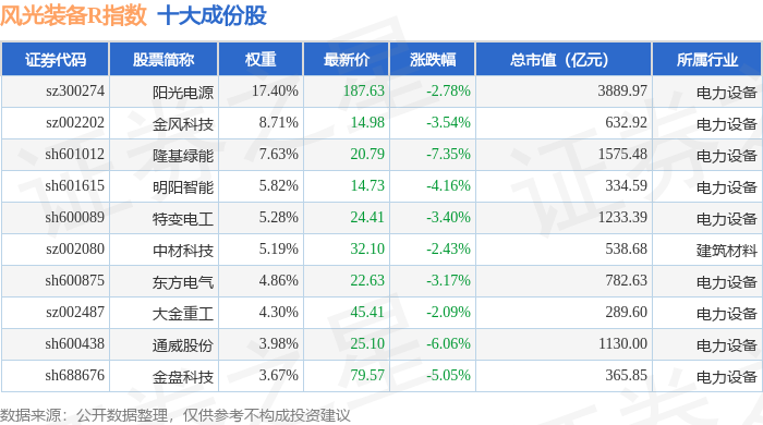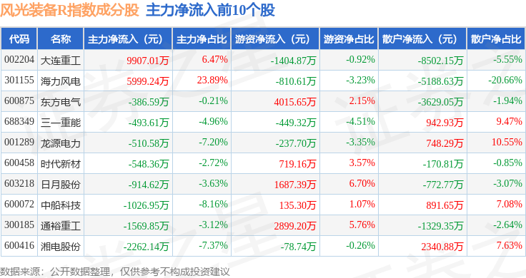 资金流向方面,风光装备R(480026)指数成份股当日主力资金净流出合计77.34亿元,游资资金净流入合计15.66亿元,散户资金净流入合计61.68亿元。成份股资金流向详情见下表: