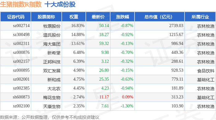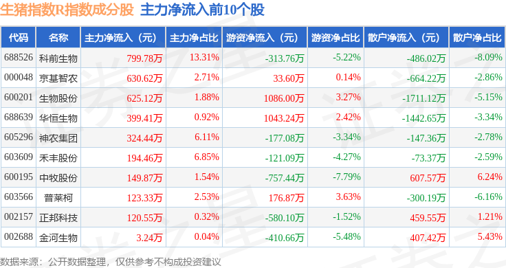 资金流向方面,生猪指数R(480073)指数成份股当日主力资金净流出合计5.19亿元,游资资金净流入合计1.42亿元,散户资金净流入合计3.77亿元。成份股资金流向详情见下表:
