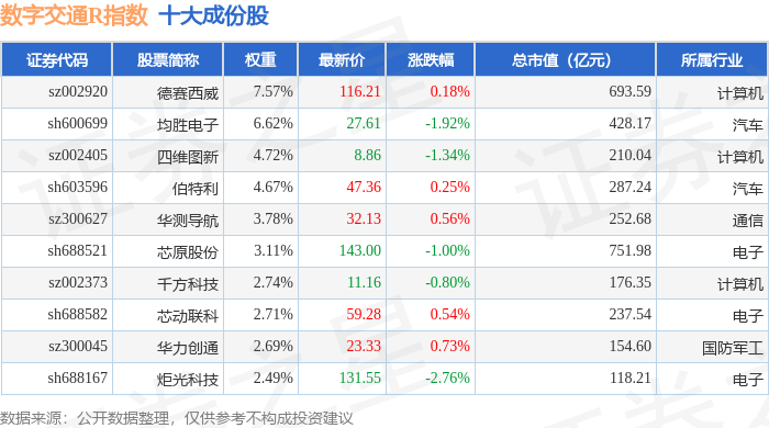 证券之星消息,11月12日,数字交通R(480075)指数报收于3305.99点,跌0.13%,成交206.99亿元,换手率1.76%。当日该指数成份股中,上涨的有23家,航天智装以16.57%的涨幅领涨,下跌的有27家,莱斯信息以12.2%的跌幅领跌。
