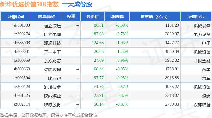 新华优选价值50R(489004)指数十大成份股详情如下: