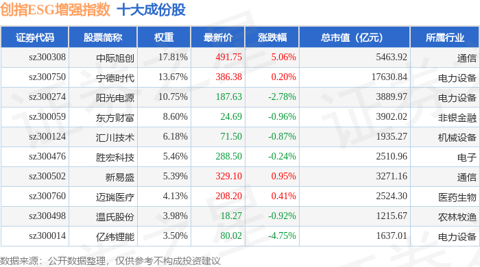资金流向方面,创指ESG增强(970034)指数成份股当日主力资金净流出合计27.78亿元,游资资金净流出合计5665.99万元,散户资金净流入合计28.35亿元。成份股资金流向详情见下表: