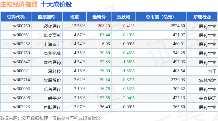 证券之星消息,11月12日,生物经济(970038)指数报收于2252.19点,跌0.37%,成交196.48亿元,换手率1.41%。当日该指数成份股中,上涨的有20家,华测检测以2.36%的涨幅领涨,下跌的有28家,福瑞股份以4.3%的跌幅领跌。