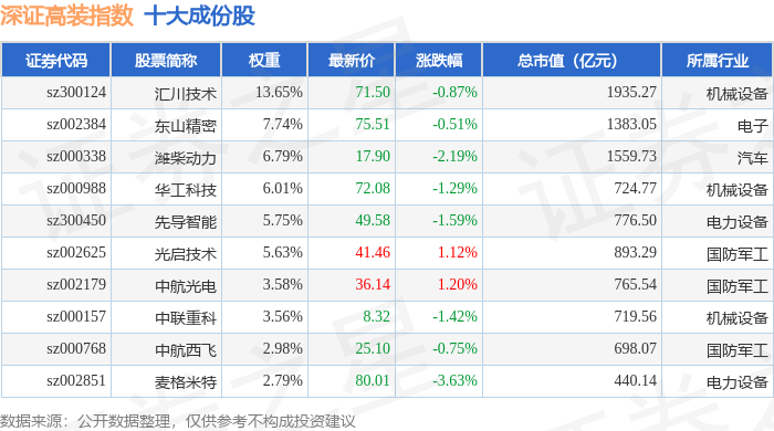 证券之星消息,11月12日,深证高装(970037)指数报收于2850.85点,跌0.83%,成交420.4亿元,换手率2.51%。当日该指数成份股中,上涨的有13家,捷佳伟创以5.53%的涨幅领涨,下跌的有37家,中科电气以4.46%的跌幅领跌。