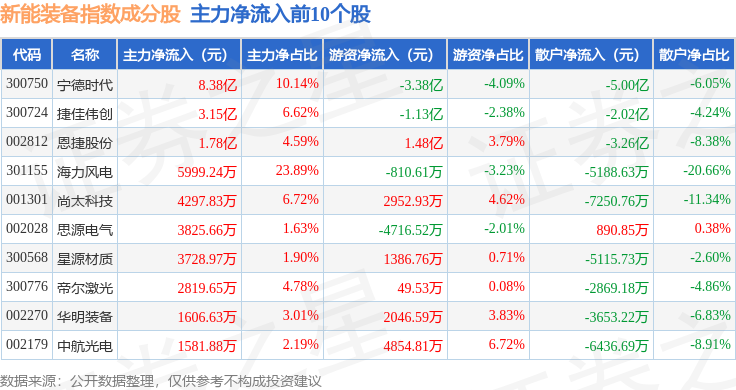 资金流向方面,新能装备(970043)指数成份股当日主力资金净流出合计58.74亿元,游资资金净流入合计16.89亿元,散户资金净流入合计41.85亿元。成份股资金流向详情见下表: