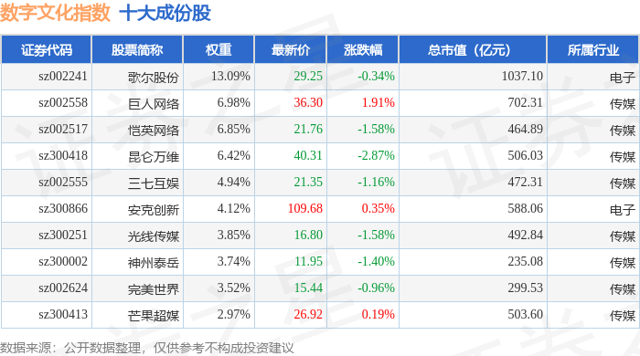 证券之星消息,11月12日,数字文化(970047)指数报收于1076.42点,跌0.9%,成交195.37亿元,换手率2.52%。当日该指数成份股中,上涨的有12家,巨人网络以1.91%的涨幅领涨,下跌的有36家,幸福蓝海以8.06%的跌幅领跌。