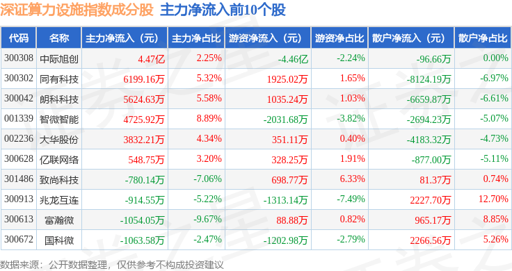 资金流向方面,深证算力设施(970051)指数成份股当日主力资金净流出合计45.96亿元,游资资金净流出合计9112.81万元,散户资金净流入合计46.87亿元。成份股资金流向详情见下表:
