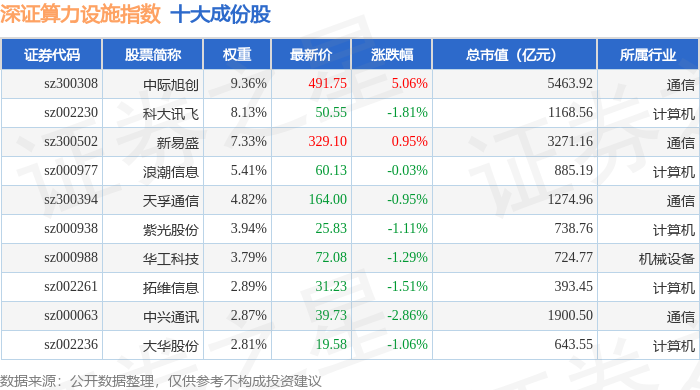 证券之星消息,11月12日,深证算力设施(970051)指数报收于10912.03点,跌0.44%,成交875.47亿元,换手率2.38%。当日该指数成份股中,上涨的有10家,中际旭创以5.06%的涨幅领涨,下跌的有40家,金信诺以3.93%的跌幅领跌。