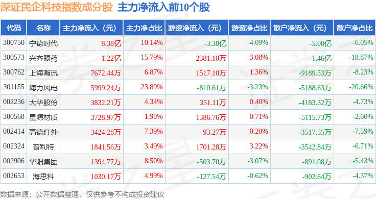 资金流向方面,深证民企科技(970059)指数成份股当日主力资金净流出合计43.2亿元,游资资金净流入合计12.12亿元,散户资金净流入合计31.09亿元。成份股资金流向详情见下表: