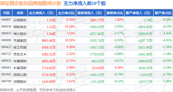 资金流向方面,深证国企股东回报(970064)指数成份股当日主力资金净流出合计5.59亿元,游资资金净流入合计3.2亿元,散户资金净流入合计2.39亿元。成份股资金流向详情见下表: