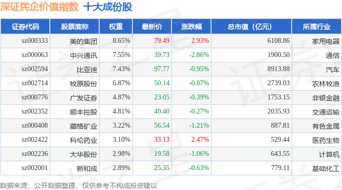 证券之星消息,11月12日,深证民企价值(970072)指数报收于3518.05点,跌0.16%,成交472.69亿元,换手率1.77%。当日该指数成份股中,上涨的有18家,捷佳伟创以5.53%的涨幅领涨,下跌的有31家,中伟股份以4.55%的跌幅领跌。