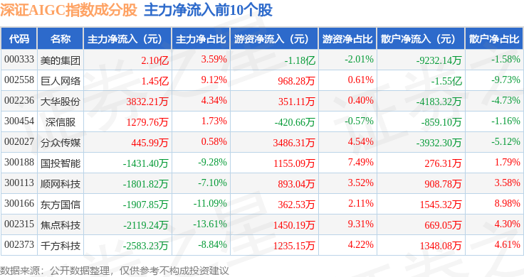 资金流向方面,深证AIGC(970075)指数成份股当日主力资金净流出合计31.7亿元,游资资金净流入合计8.88亿元,散户资金净流入合计22.83亿元。成份股资金流向详情见下表: