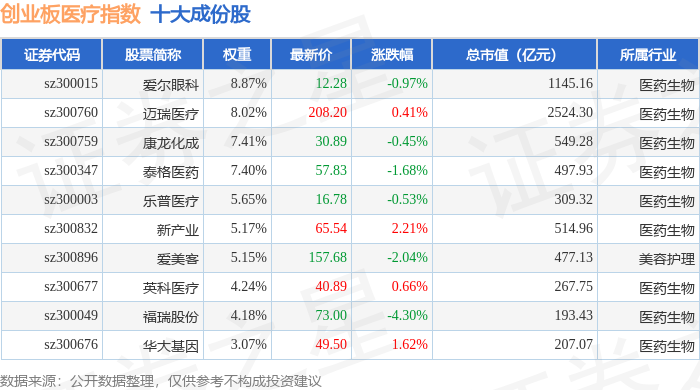 证券之星消息,11月12日,创业板医疗(970082)指数报收于3899.06点,跌0.09%,成交133.85亿元,换手率1.75%。当日该指数成份股中,上涨的有33家,冠昊生物以7.47%的涨幅领涨,下跌的有17家,福瑞股份以4.3%的跌幅领跌。